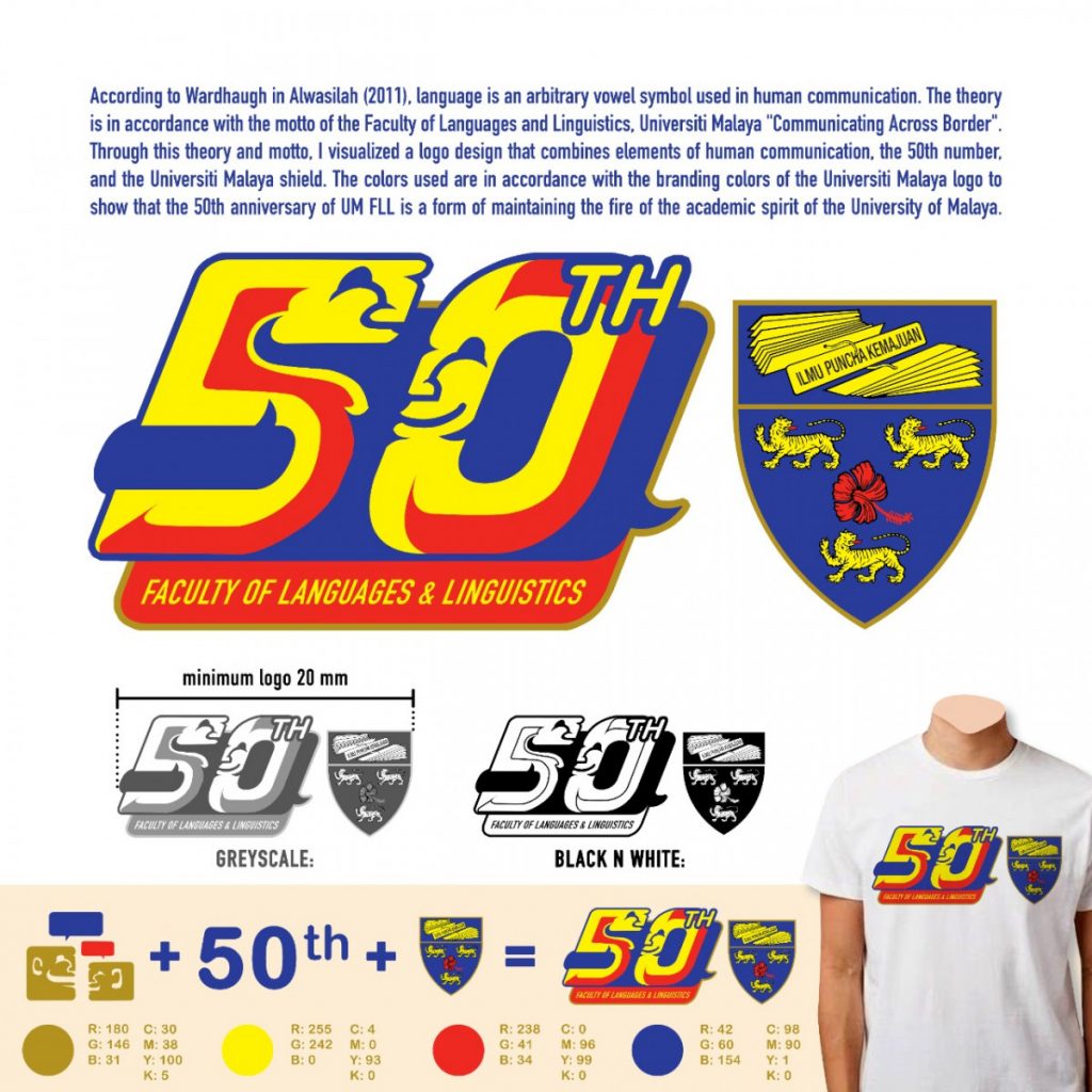 “Untuk penggunaan warnanya, kami memakai warna branding dari Malaya University, yaitu biru, kuning, merah, dan kemudian kami padukan,” ungkapnya.