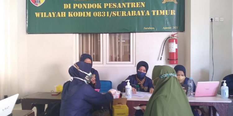 Surabaya (26/8). Selasa lalu, Kodam V Brawijaya bekerjasama dengan pelaksana lapangan Kodim Surabaya Timur, Koramil Tambaksari, serta tim dari RS DKT Gubeng menggelar vaksinasi di Pondok Pesantren Subulussalam (24/8).